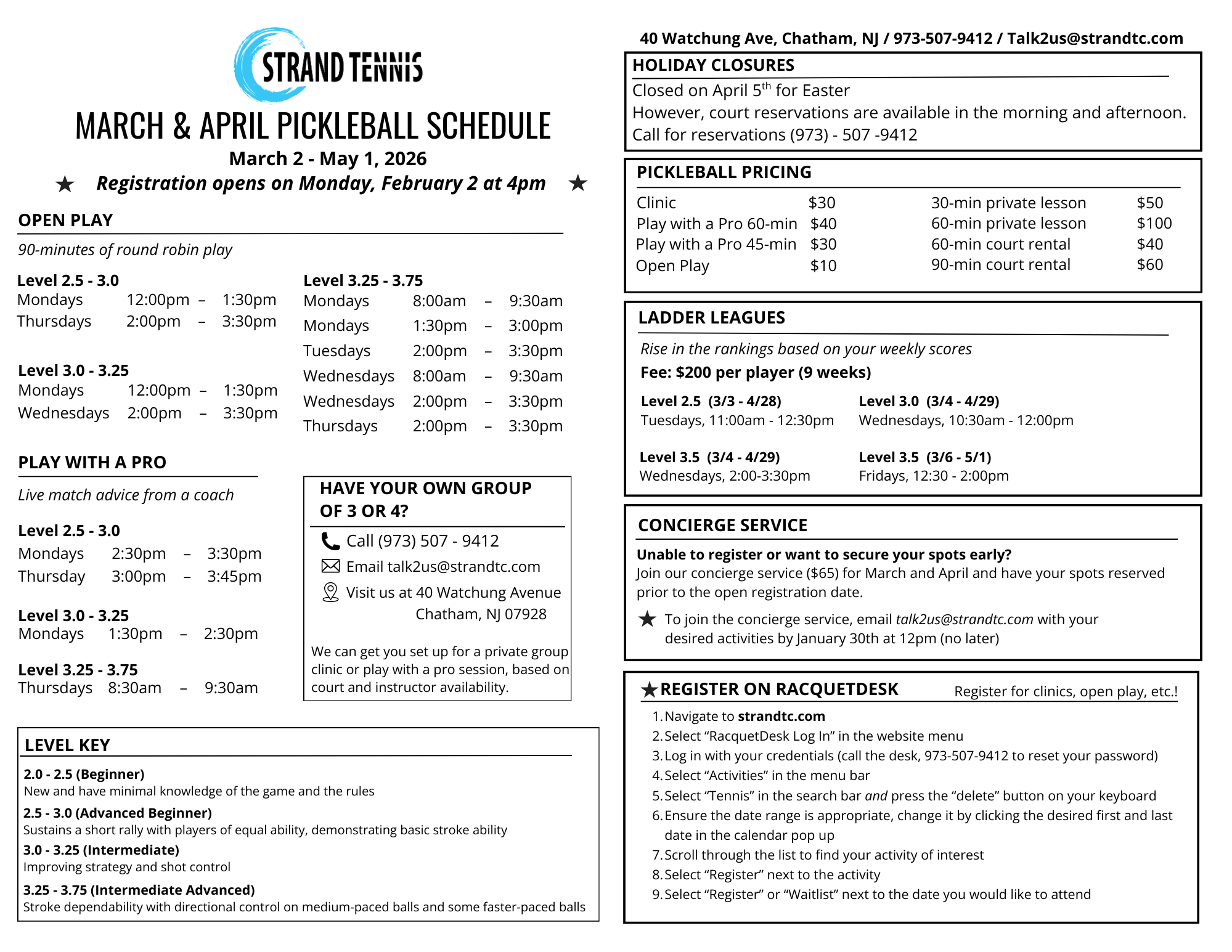 Registration opens on Monday, February 2nd at 4pm on RacquetDesk